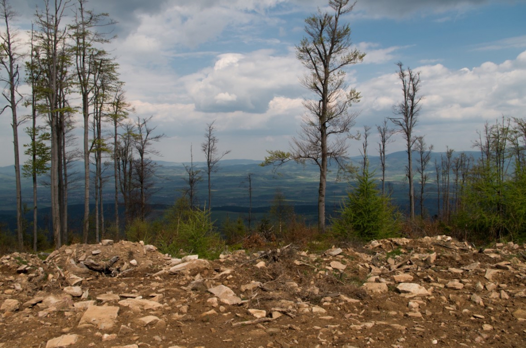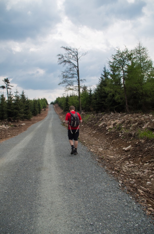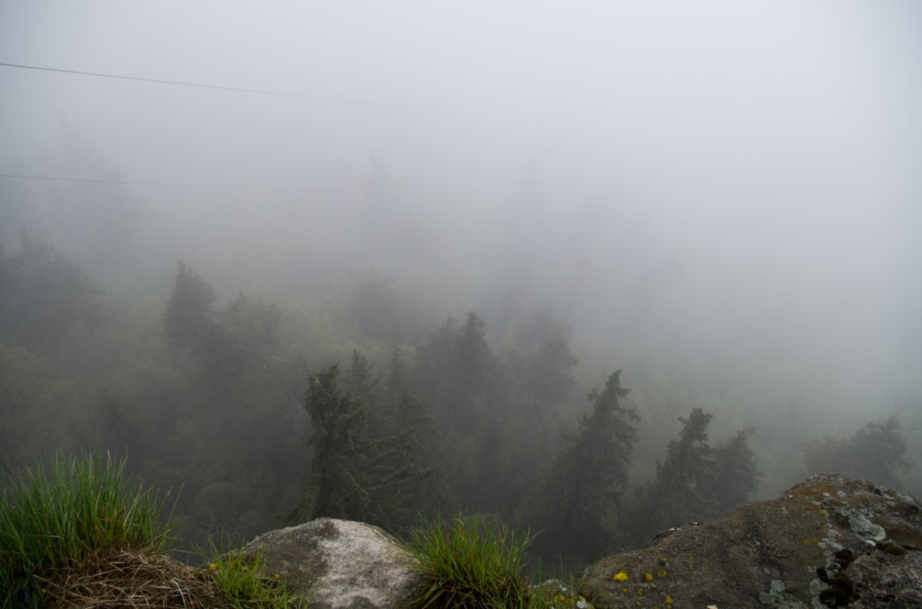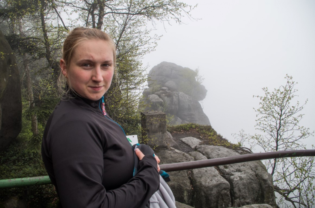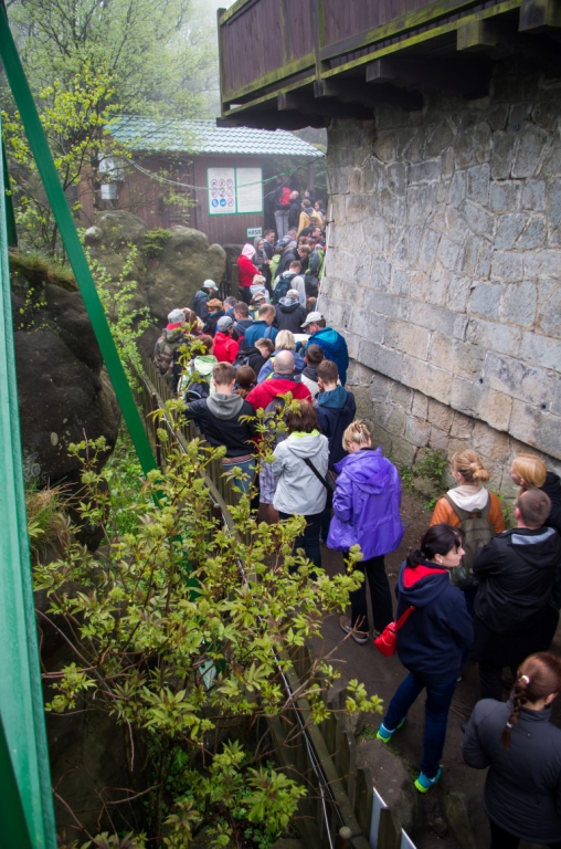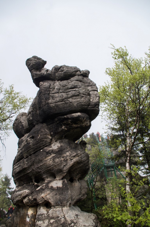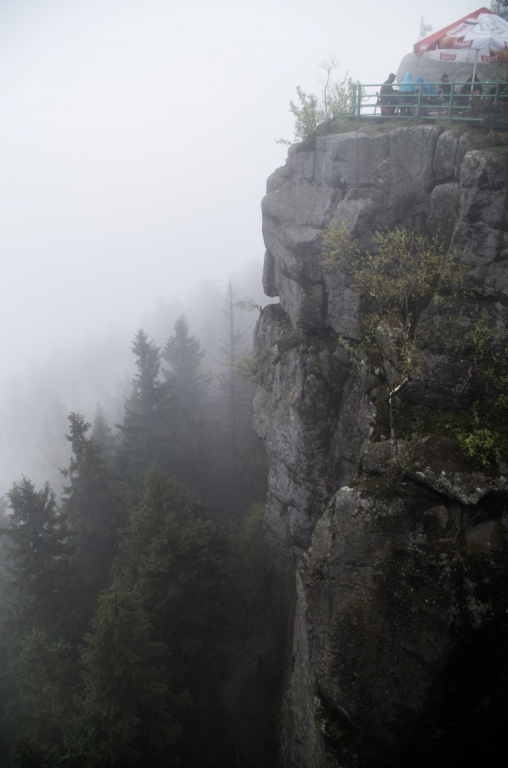 Drugiego maja po przebudzeniu okazało się, że raczej pogoda nie będzie nas dzisiaj rozpieszczać. Ale po zjedzeniu śniadania i sprawdzeniu pogody, która niestety tego dnia zapowiadała się deszczowo decyzja zapadła, że idziemy w Góry Stołowe. Zebraliśmy się zabraliśmy wszystkie niezbędne rzeczy, które mogą być potrzebne w taką pogodę i wyruszyliśmy. Samochód zostawiamy na jednym z wielu płatnych parkingów w Karłowie nieopodal wejścia na schody prowadzące na Szczeliniec. Parking kosztuje 5 złoty za nieokreślony czas parkowania więc cena jest ok. Przed dojściem do słynnych 655 schodów na szczyt mijamy liczne stragany z oscypkami, których kilka zakupimy po powrocie 🙂 . Dochodzimy do schodów, a więc komu w górę temu w czas 🙂 . Schody pokonujemy dosyć szybko i sprawnie. Mimo wszechobecnej mgły dookoła jest sporo ludzi. Szybko jesteśmy przy schronisku. Tam podbijamy sobie książeczki zdobywców Korony Gór Polski. Przed dalszą trasą pozostaje nam odstać swoje w w kolejce po bilet na drugą część tzw. „trasę turystyczną”, która jest płatna i tam znajduje się właściwy najwyższy szczyt Gór Stołowych – Szczeliniec Wielki, a dokładnie Tron Liczyrzepy lub Tron Karkonosza lub Fotel Pradziada, jak kto woli. Ponieważ pogoda jest dzisiaj jaka jest, na szczycie niestety nie widać nic dalej niż na odległość kilkudziesięciu metrów. Wszystko tonie w chmurach, ale też czasami na pocieszenie gdzieniegdzie nieśmiało wychodzi słońce zza chmur.