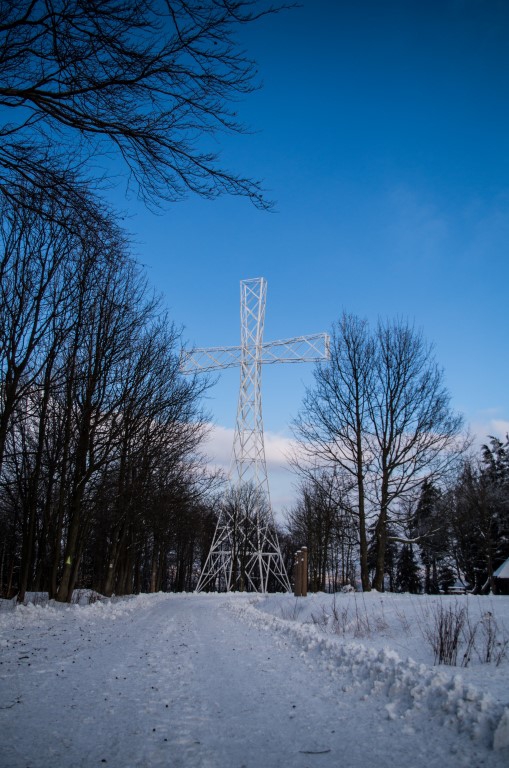 Chełmiec jest naszym ostatnim szczytem KGP zdobytym podczas zimowej wyprawy. Pomimo, że wiadomo, że Chełmiec był nie słusznie uznawany najwyższym szczytem w tym paśmie gór ze względu na błąd w pomiarach zaliczający wieże znajdującą się na szczycie do jego wysokości, to wciąż jest on uznawany za najwyższy w Koronie Gór Polski. Faktycznie wyższa od niego jest Borowa 853 m n.p.m., na którą też pewnie w przyszłości się wybierzemy. Na szczyt wchodzimy szlakiem, żółtym od strony Wałbrzycha. W naszej wędrówce towarzyszą nam brat mojego męża z dziewczyną, także lubiący górskie wędrówki. Samochód zostawiamy na parkingu osiedlowym umiejscowionym tuż pod górą. Szlak nie należy do najdłuższych idzie się przyjemnie. Po drodze tuż przed samym szczytem napotykamy drzewo tak skrzypiące przy każdym podmuchu wiatru, że obawiamy się przechodząc, że zaraz na nas runie. Na szczycie znajduje się Radiowo Telwizyjny Ośrodek Nadawczy oraz duży 45 m krzyż. Do lat 50 ubiegłego wieku znajdowało się schronisko, obecnie chyba też można poczęstować się herbatą, ale nie w lutym. W dniu kiedy byliśmy wszystko było zamknięte,  ale wniesiona herbata w termosie sprawdziła się idealnie.