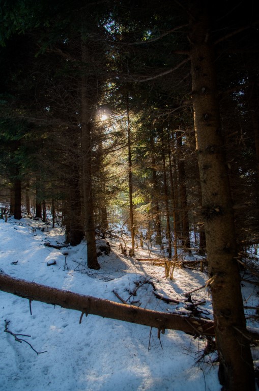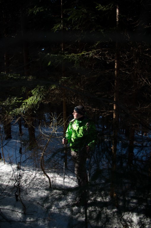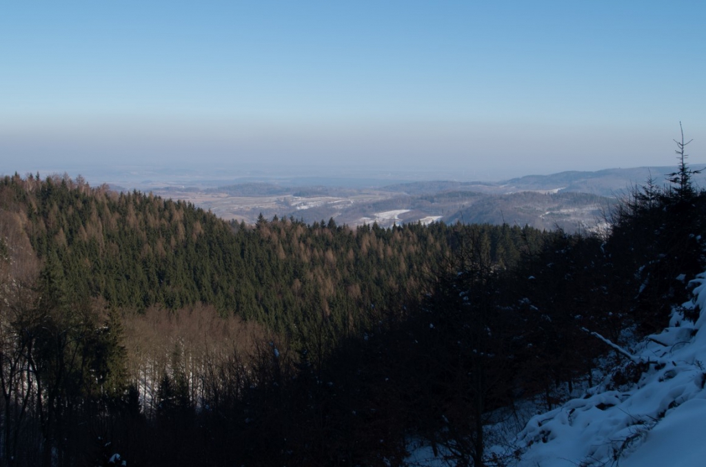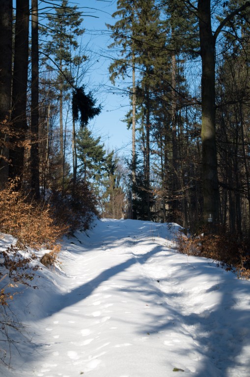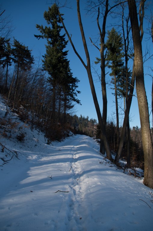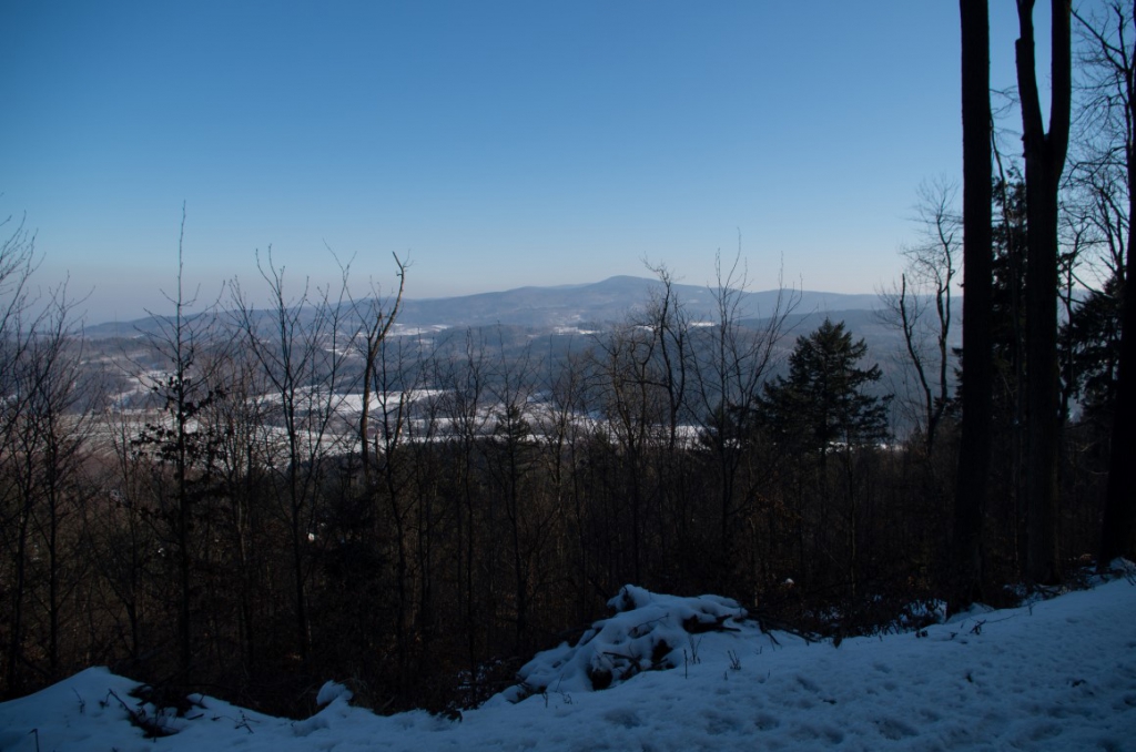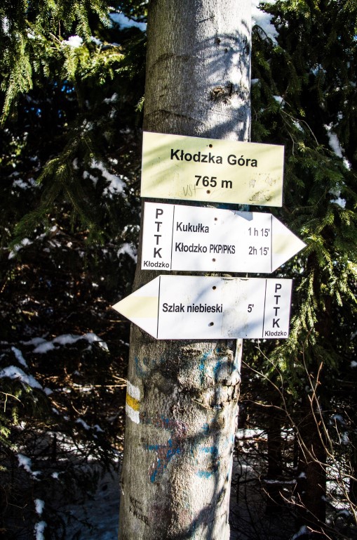 W drodze powrotnej widząc ślady na śniegu nie prowadzące szlakiem tylko omijające Grodzisko. Postanawiamy kierując się mapą zboczyć ze szlaku i spróbować ominąć ten szczyt. To była dobra decyzja zbaczając ze szlaku w dół tuż przed samym Grodziskiem trafiamy na trasę, która była wytyczona na drzewach chyba dla jakiegoś rajdu rowerowego. Doprowadza nas ona do drogi, która wiedzie równolegle do szlaku zboczem z pięknymi widokami prowadząc nas prosto do parkingu leśnego, na którym zostawiliśmy samochód. Nie rozumiem dlaczego trasa na szczyt Kłodzkiej Góry wytyczona została w tak nieciekawy sposób skoro istnieje dziesięć razy lepsza z widokami alternatywa dla niej.