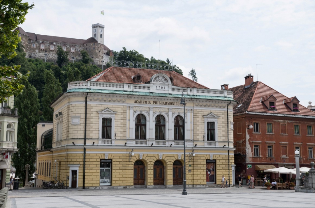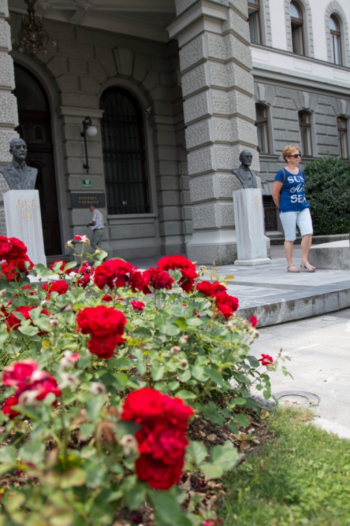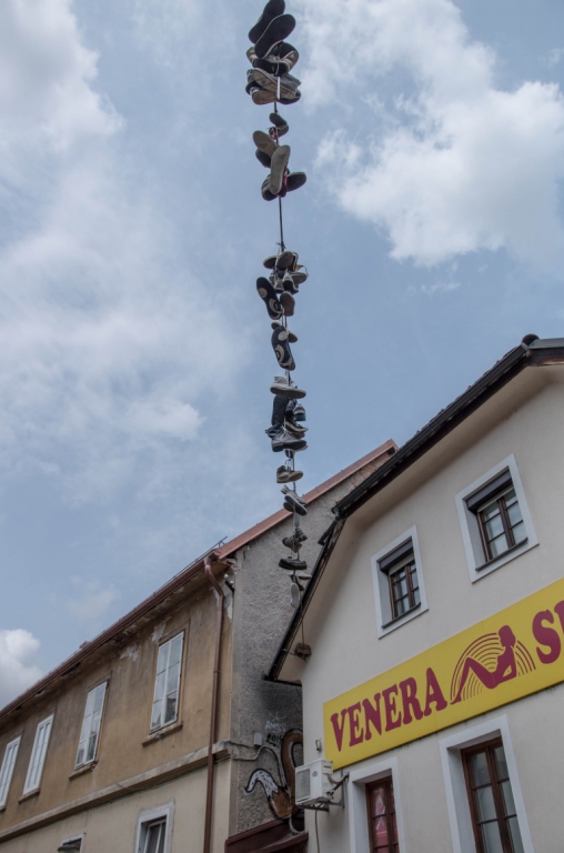 Dalej krążymy zwiedzając zakątki Lublany trafiamy na Kongresni trg, podziwiamy piękną niestety zamkniętą barokową budowlę klasztoru Urszulanek. Tuż obok znajduje się Uniwersytet Lublański. Po drodze mamy okazję oglądać niecodzienny zwyczaj zawieszania butów na lince zawieszonej nad ziemią. Mijamy też niecodzienny balkon zarośnięty trawą.