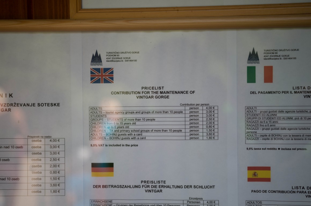 Wąwóz Vintgar oddalony jest od Bledu o 4 km. Do wąwozu można wejść z dwóch stron od strony wsi Podhom lub Zasip. Bilet wstępu normalny kosztuje 4 euro. Poniżej zdjęcie cennika. Samochód zostawiamy na parkingu tuż przed wąwozem we wsi Podhim. Parking jest tutaj bezpłatny i nie ma problemów z miejscem.